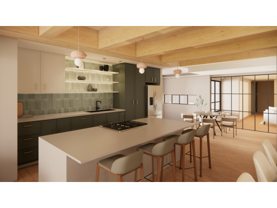 Zona social amplia: sala, comedor, cocina abierta con barra y terraza sin poniente